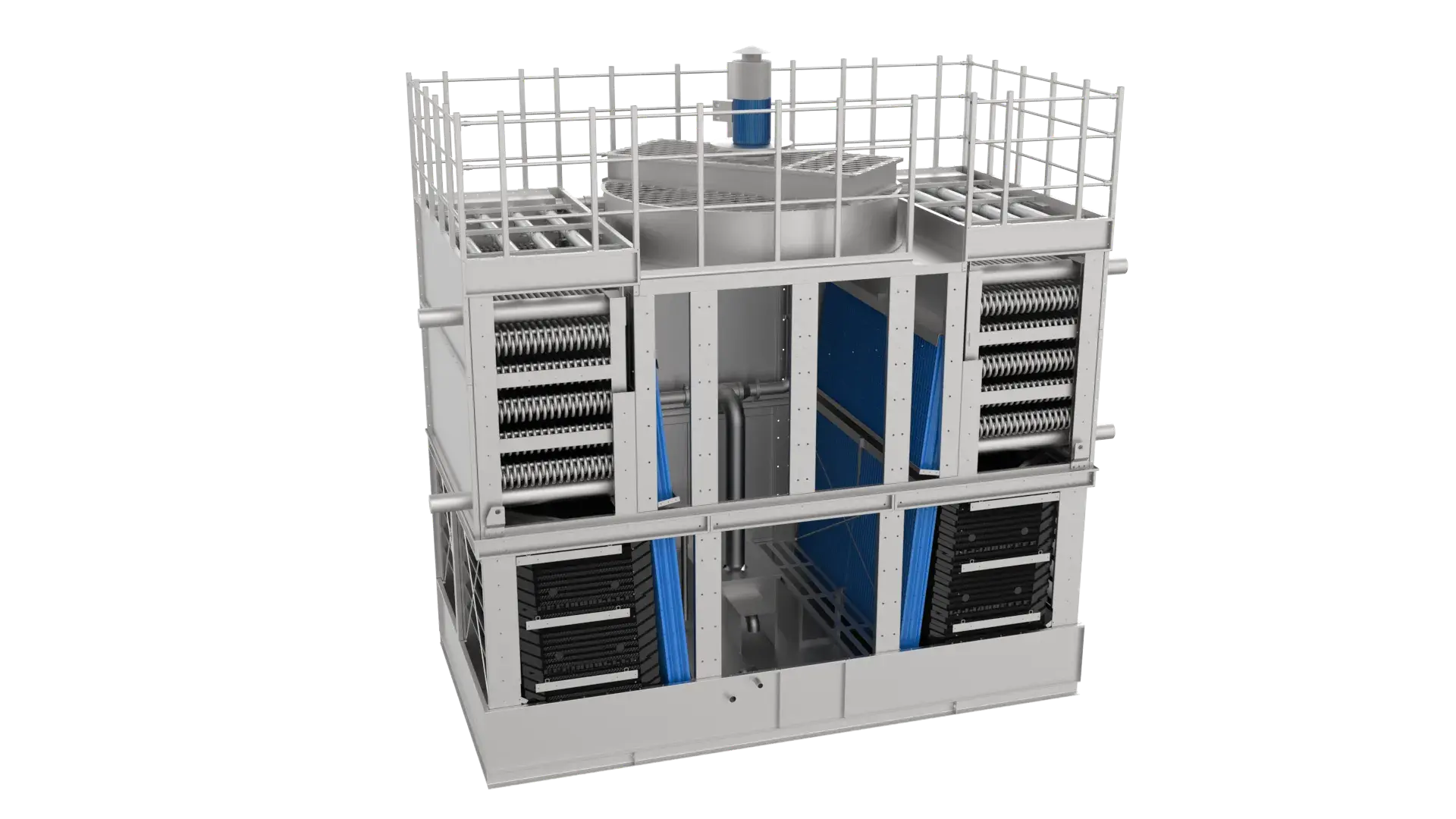 The gaseous refrigerant and spray water flow in the same direction within the heat exchange tube bundle, typically from top to bottom. Cooling water is uniformly distributed across the packing surface via a water distribution system or nozzles, forming a thin water film. Simultaneously, negative pressure generated by fans draws external air into the tower through the packing on both sides of the condenser. This air flows horizontally across the packing layer, ensuring thorough contact with the water film. This cross-flow air pattern in cross-flow evaporative cooling enables the hot fluid to contact relatively cooler water and air immediately upon entering the tube bundle. This configuration achieves high heat exchange efficiency, allowing hot water to be cooled to the required temperature within a short timeframe.